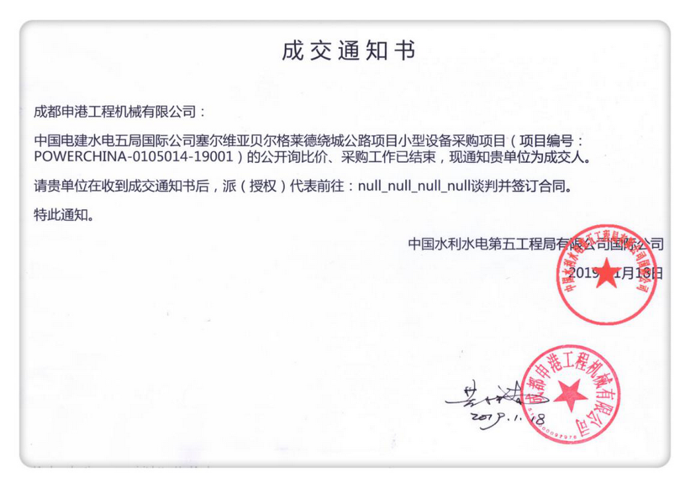 2019年1月18日,我公司收到中國(guó)電建水電五局國(guó)際公司發(fā)來(lái)的關(guān)于塞爾維亞貝爾格萊德繞城公路項(xiàng)目小型設(shè)備采購(gòu)項(xiàng)目的“成交通知書(shū)”,我公司為成交人,目前該設(shè)備已用木箱包裝完畢,準(zhǔn)備發(fā)往指定港口。